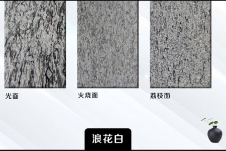 主要专业生产:浪花白(海浪花)、芝麻灰、芝麻黑、廉江花、芝麻白、广东芝麻白、浪淘沙等花岗岩石材。可生产光板、火烧面、荔枝面、喷砂面、斧刀面,自然面、拉丝面、路沿石、60-一米头各种等工程板、异形弧形加工等